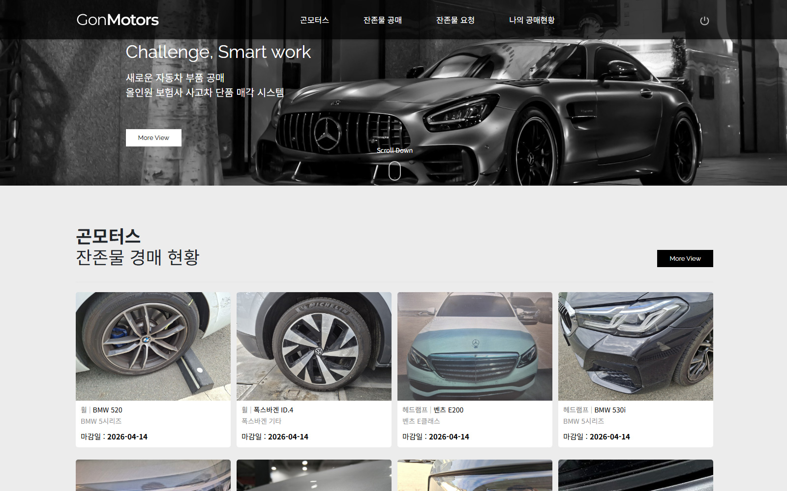 보험사, 카센터, 일반회원 등 회원 유형에 따라 흐름이 나뉘는 차량부품 공매 사이트로, 단순 소개형이 아닌 기능 중심의 운영형 플랫폼입니다.