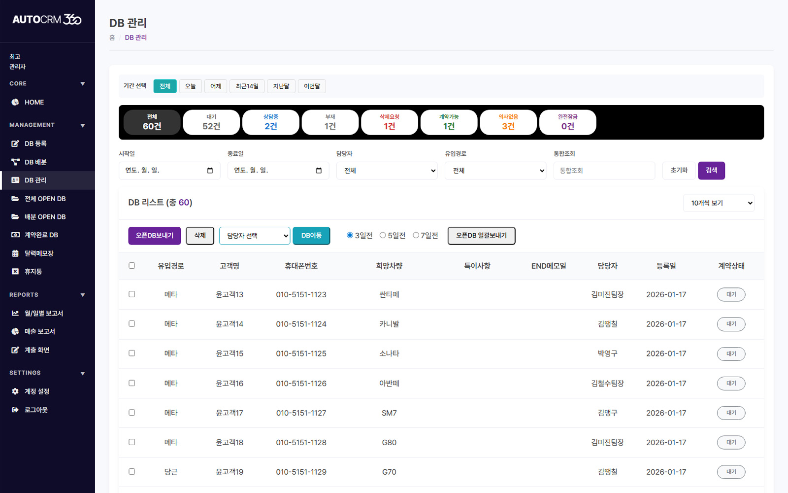 장기렌트 영업회사에서 사용하는 CRM으로, DB 등록과 랜딩페이지 연동, 팀 관리와 자동 분배, 보고서와 계약 현황 관리까지 운영 중심으로 설계된 프로젝트입니다.