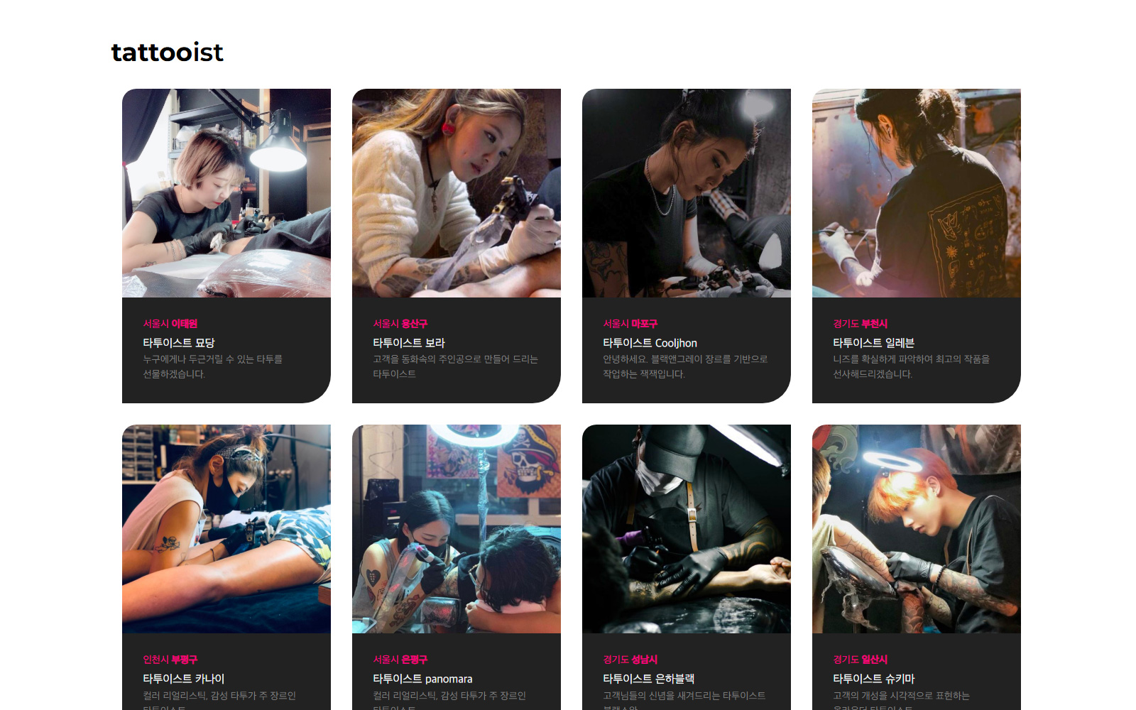 지역별 타투이스트와 포트폴리오를 검색하고, 유저가 원하는 스타일의 작업자를 찾을 수 있도록 만든 타투이스트 연결형 O2O 플랫폼입니다.