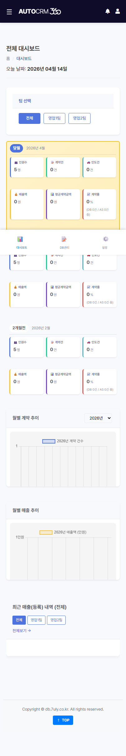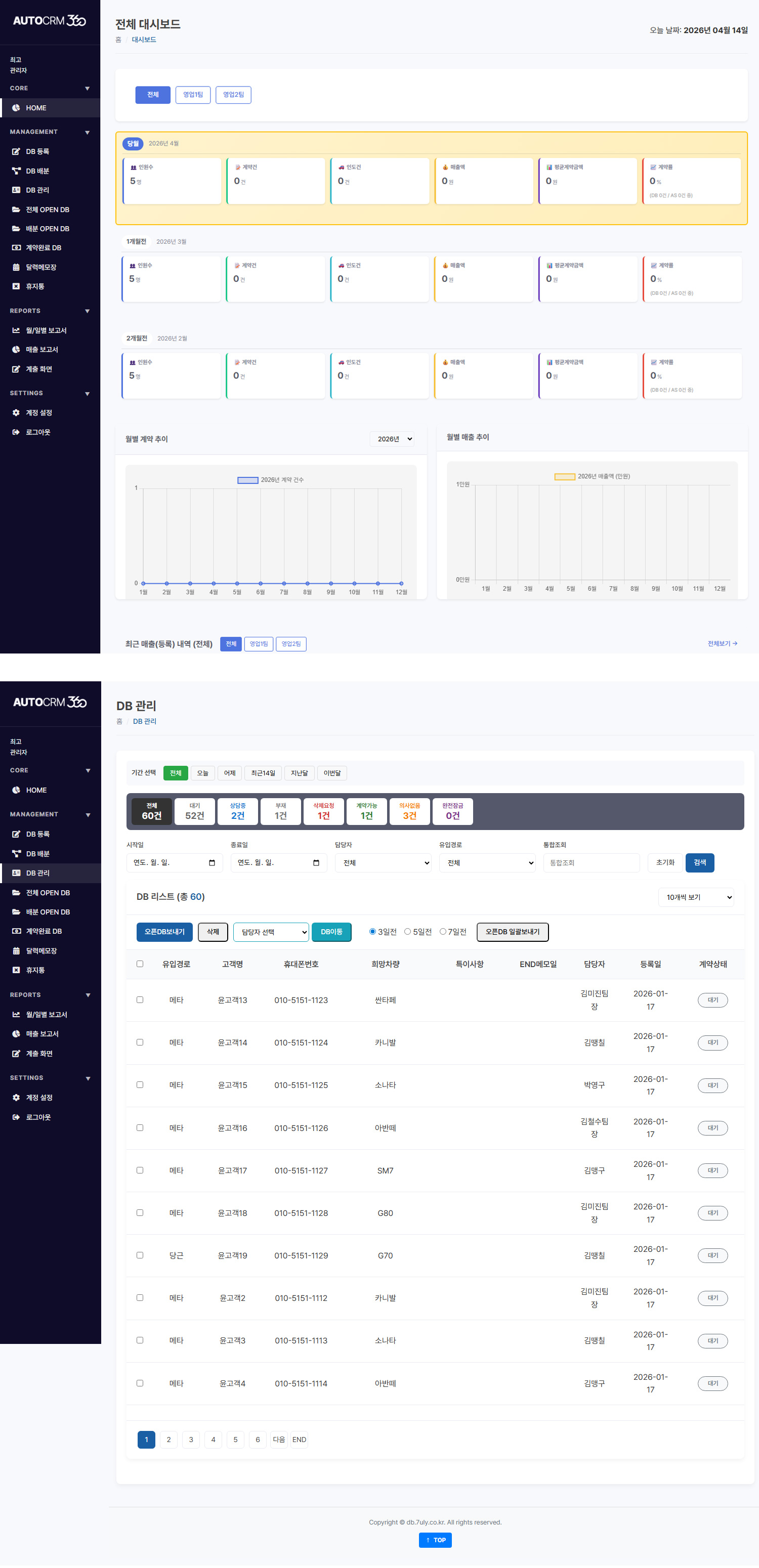 장기렌트 영업회사에서 사용하는 CRM으로, DB 등록과 랜딩페이지 연동, 팀 관리와 자동 분배, 보고서와 계약 현황 관리까지 운영 중심으로 설계된 프로젝트입니다.